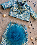 Полата Aqua Laura е изработена от жакардов плат със златисти елементи. Кройката е семпла, с ластик на талията. Ефектно цвете от мек тюл в цвят петрол в предната част раздвижва визията. Перфектна в комбинация със сакото от същата серия.