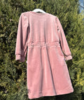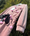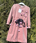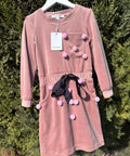 Стилна детска рокля от меко кадифе в нежен пепел от рози нюанс. Моделът е с права, леко вталена линия и дълъг ръкав. Горната част е декорирана с меки помпони, които придават игрив и артистичен характер. В талията е с колан, подчертан с черна сатенена панделка, добавяща контраст и елегантност към цялостната визия. Допълнителни помпони по полата и около джобовете създават завършен и разпознаваем стил.