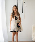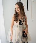Champagne Petals е въплъщение на нежност и стил – изискана детска рокля в деликатен nude нюанс на черни цветя. Горната част е с вдигната талия. Закопчава се с цип и красива перла на гърба. Полата е набрана в талията, обемът е постигнат от пластове мрежа на цветя и тюл в nude. Моделът е с мека подплата и mini дължина. Добавихме пера и кристали.