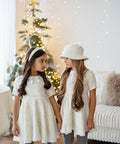 Роклята Écru Charm е от мека материя в екрю с бляскави сребристи и златисти нишки. Разкроен модел, с къс ръкав и нежна декорация- панделка с брошка. Добавете и шапката от същата материя.