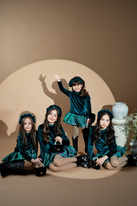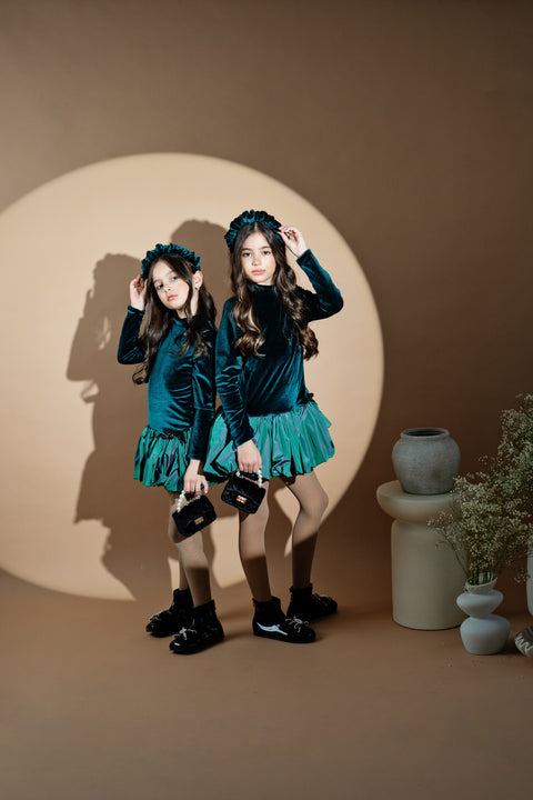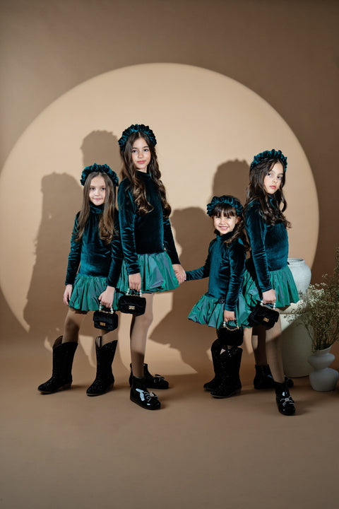 Green Enigma е впечатляваща рокля от горна част - меко зелено кадифе с поло яка. Долната част е от промазан плат също в зелено. Модел с дълги ръкави, закопчаване с цип. Декорирахме с черна сатенена панделка с перличка.