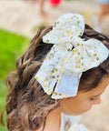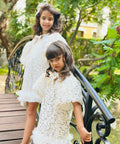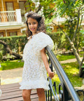 Роклята Lace Garden е изработена от нежна бяла дантела, обсипана със златисти пайети. Роклята е със свободна кройка и ефектно буфан ръкавче. В долната част роклята е завършена с нежен тюл, който придава елегантност и романтика. Подплатена с мека памучна основа, тя осигурява комфорт и свобода на движение. Закопчава се с цип.