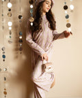 Баретата Purple Edge е нежното допълнение към цялата визия. Изработена от меко и еластично плетиво, вискоза в сиво и зелено. Декорирахме с нежен златист елемент. В комбинация с блузата и панталона от серията Purple Edge създава цялостен и хармоничен сет.