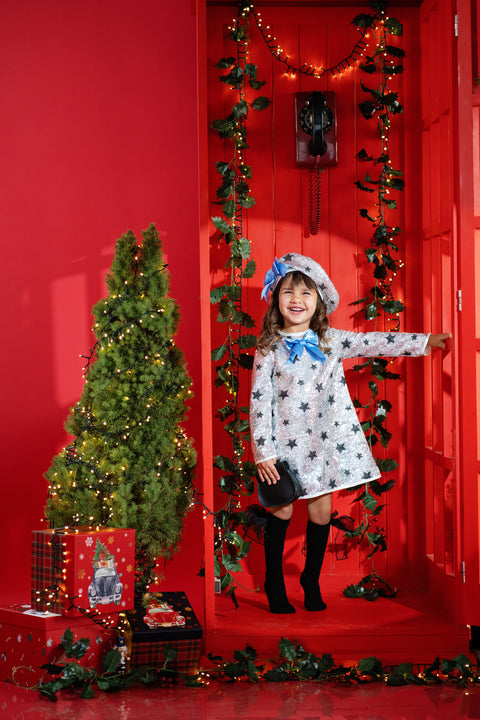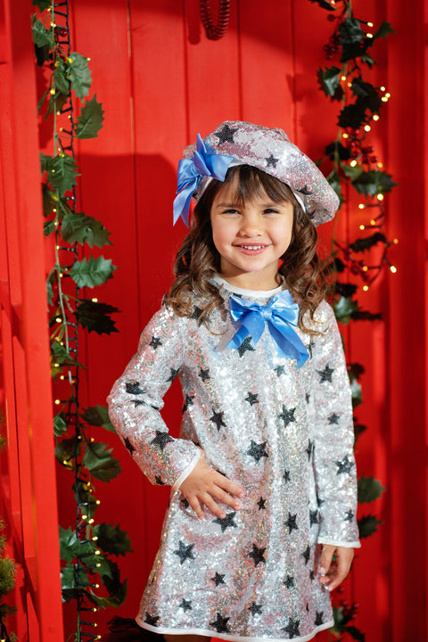 Баретата Silver Starlette е очарователен акцент, вдъхновен от френския шик. Изработена от същата сребриста пайетена материя със звезди, тя е украсена с нежна сатенена панделка в небесносин цвят. Перфектното допълнение към роклята Silver Starlette.