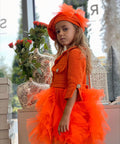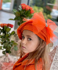 Tangerine Chic е барета, която добавя френски шик към всяка визия. Изработена от луксозна букле материя в ярък оранжев цвят, тя приляга удобно и оформя красиво лицето. Голямото нежна тюлена панделка завършва визията. Идеална за комбинация с роклята Tangerine Couture или самостоятелно към зимни и празнични облекла.
