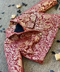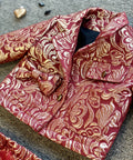 Сакото Burgundy Éclat впечатлява с богатия си бордо нюанс и фини златисти отблясъци. Изработено от луксозен жакард. Къс модел, с декоративна панделка и златисти копчета.