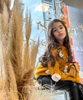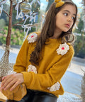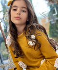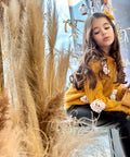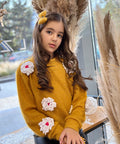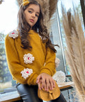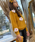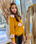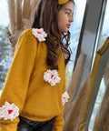 Пуловерът Marigold Dream е изработен от пухкаво плетиво в цвят горчица. Той е с обло деколте и дълги ръкави. Декорирахме с ефектни цветя в бяло. Съчетайте с пола или клинче.