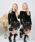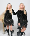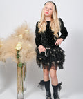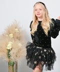 Noir Fantasy е създадена за момичета, които обичат да блестят. Горната част е изработена от меко черно кадифе, обсипано с бродерия от малки златни точки. Долната част впечатлява с ефирни волани от черен тюл на златни звездички. Къс модел. с дълги ръкави и ефектен златист декоративен елемент на талията.