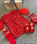Red Brilliance е рокля, създадена за истински празнични мигове. Изработена от материя, обсипана с червени пайети. Моделът е леко разкроен, тип трапец. Ръкавите са особено ефектни, изработени богато с пера също в червено.
