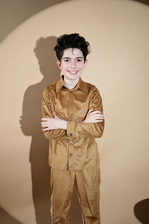 Daren са стилни панталони от мек велур в кафяво. Моделът е свободен, с джобчета, колан с ластик. Няма закопчаване. Комбинирайте с ризата от същата материя.
