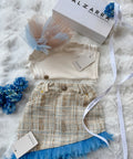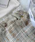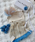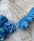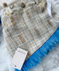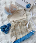 Прекрасен сет от пола от букле, декорирана УАУ със сини пера и crop top с тюл по ръкавите.