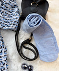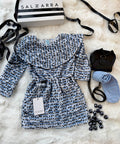 Прекрасен сет от сладка рокля букле в синьо и екрю, син фигурален чорапогащник и черна кожена чанта.