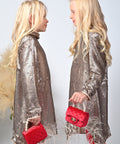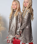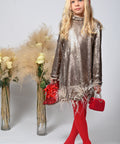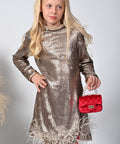 Alla in Gold е символ на празничен разкош. Изработена от висококачествена тъкан, покрита с фини пайети в цвят старо злато. Моделът е лек трапец, с дълги ръкави и поло яка. В долната част е с асиметрия. Там декорирахме и с прекрасни пера също в Nude. Закопчава се с цип, има подплата.