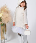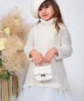 Рокля Vanilla Cloud е като докосване до облак – пухкава, ефирна и изящна. Изработена от меко плетиво в деликатен ванилов нюанс. Модел с поло яка и дълги ръкави. В долната част е с волан от тюл. Декорирахме с нежни сатенени панделки. Добавете и баретата от същата серия.