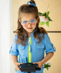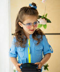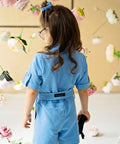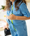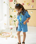 Ефектен детски гащеризон от висококачествен памук в прекрасно синьо. Той е къс, с коланче в талията и контрастен цип в неоново зелено отпред. Модел с джобчета и къси ръкави.