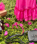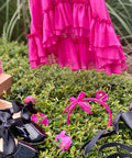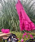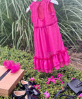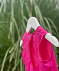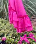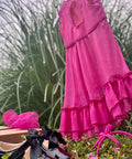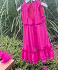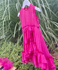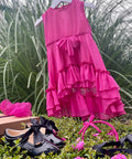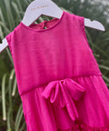 Красива рокля в изключително нежен циклама цвят. Изработена от фин шифон с брокатен блясък. Роклята е без ръкави с разкроена асиметрична пола. Гърбът е оформен с елипсовиден разрез. Закопчава се с копченце на врата. В предната част е поставена ефектна панделка от плата също в циклама. Роклята е с мека памучна подплата.