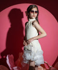 Рокля Moonlight Bloom е израз на модерна елегантност с нотка на приказен стил. Изработена от луксозен бродиран плат в IVORY. Тя е без ръкави. Горната част е особено атрактивна, с нежна луксозна перла, поставена на златна основа. Закопчава се с цип. В долната част добавихме обемно цвете от ефирна органза.