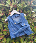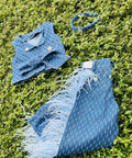 The Blue Blossom Headband is a sweet finishing touch to the Blue Blossom denim set. It is wrapped in denim fabric with a decorative flower with pebbles.