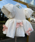 Crema Bow is the delicate final accent to the look. Made of fine ecru lace, decorated with pink satin and a small shiny element, it creates a delicate and festive effect.