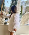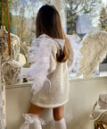 Lunelle is designed to bring magic and warmth to every winter day. The dress is made of elastic knit in ecru. Model with a straight silhouette, long sleeves and a round neckline. An effective accent is the tulle along the entire length of the sleeves.