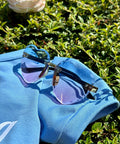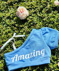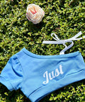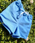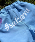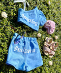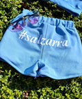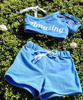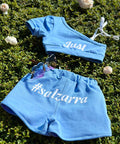 Azure Dream Set is a modern set for little ladies. Made of soft cotton in white with a print. The top is short, with short sleeves on one shoulder, and on the other it is tied with laces. The pants are short.