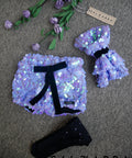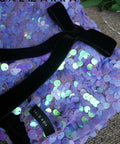 Stella Glow are striking shorts made of glittering purple sequin fabric. The waist is shaped with an elastic band, and the black velvet belt adds a subtle finish and sophistication.