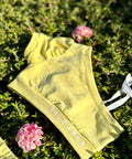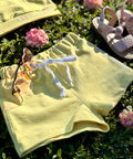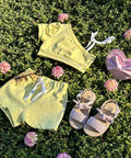 Sunshine Glow Set is a modern set for little ladies. Made of soft cotton in white with a print. The top is short, with short sleeves on one shoulder, and on the other it is tied with laces. The pants are short.