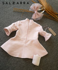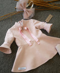 A delicate pink dress for little princesses. Model with bell sleeves and a flared, lace-up bottom. We decorated it with a pink ribbon. The dress fastens with a zipper and is lined.