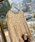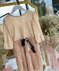 The Soft Éclat dress is designed to shine with discreet luxury and ethereal beauty. The top is covered in shimmering sequins. The bottom is made of soft, feathery fabric, creating a sense of movement and lightness. The satin ribbon at the waist completes the look with a sophisticated accent.