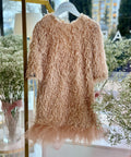 Vienna Glow is made of fine feather fabric in beige. Loose model, with 7/8 sleeves. At the bottom it has a tulle ruffle in Nude. It ties at the back with a satin ribbon. Add an accessory and complete the look.