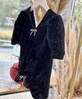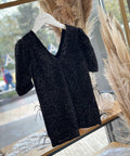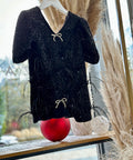 The Eclissa Noir dress is designed to impress. It is made of black fabric, with good elasticity, with woven silver threads that give a delicate shine when moving. The model is short, and we have decorated it with feathers all over the front. Delicate ribbons of shiny stones complete the look.