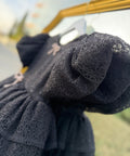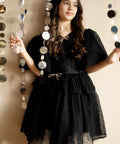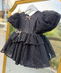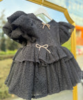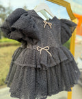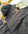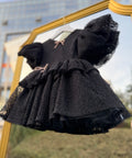 Emera dress is crafted from beautiful black lace. The design features voluminous puff sleeves, adding a dramatic and elegant touch. The skirt is composed of two lace ruffled tiers that fall gracefully, complemented by tulle for a regal volume. The dress fastens with a back zipper. Delicate bows embellished with tiny stones add an extra touch of refinement and elegance to the overall look.