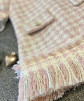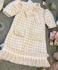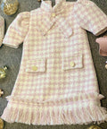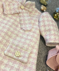 Rosé Elegance е елегантна детска рокля. Тя е изработена от мека материя - вълна и памук в пепит в розово. Тя е разнищена в долната част. Модел лек трапец, с подплата. Декорирахме с нежни капачета със златисти елементи.