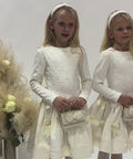 The Ivory Ribbons dress is the epitome of gentle luxury. Made of fine cotton in a soft ecru shade. Model with a round neckline, long sleeves and corset lacing at the back. The lower part is gently cut, decorated with satin ribbons.