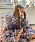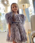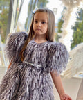 Silver Girl е изработена от плат на ресни в сиво. Тя е с буфан ръкави и обло деколте. Закопчава се с цип, а в талията добавихме и подвижно коланче. Добавете Аксесоара и Чантата от същата материя и завършете визията.