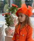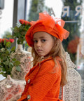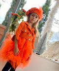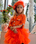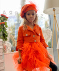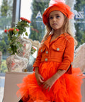 Tangerine Couture is a dress designed to be the center of attention. The top is made of high-quality bouclé fabric in bright orange, with elegant 3/4 sleeves and decorative pockets, finished with crystal buttons. The contrasting bottom impresses with a rich multi-layered skirt of bright orange tulle, which creates movement, volume and a true haute couture effect.