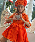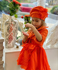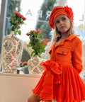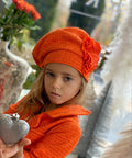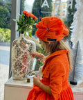 The Orange Flame Beret is a beret that completes the look with artistic finesse and a bright presence. Made of luxurious bouclé in rich orange, it sits beautifully on the head and shapes the silhouette in an elegant way. The pleated soleil curl on the side adds dynamism, volume and a haute couture mood. The model is ideal in combination with the Orange Flame Couture dress, but can also be worn alone for a fashionable and festive look.