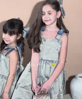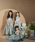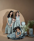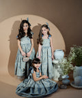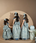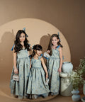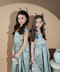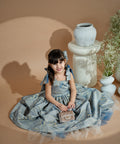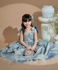 Blue Royale Jacquard is a luxurious long children's dress. It is made of high-quality jacquard with golden woven elements. The dress has shoulder straps. The model fastens with a zipper. The lower part is cut out spectacularly with several layers of tulle.