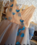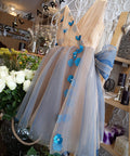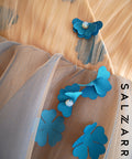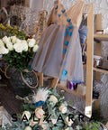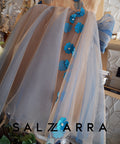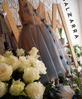 The Floréan Dream dress is a true embodiment of fairytale elegance. The top is made of soft nude satin, luxurious tulle and 3D flowers in petrol blue with crystal decoration. On the back it has a lush ribbon of the same tulle. The dress fastens with a zipper on the sides. The dress is ankle-length.