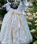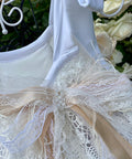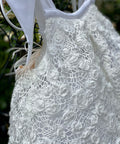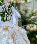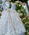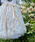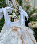 Изключително нежна и романтична детска рокля в бял цвят. Моделът впечатлява с богата дантелена текстура и ефирен силует, който създава усещане за приказна лекота. Горната част е с деликатни презрамки от сатен, които се връзват на паменете на панделки. Добавихме прекрасна пандела от сатен, дантела и бляскави камъчета на деколтето. Роклята е бухнала, обемът се постига от пластовете тюл. Има мека подплата.