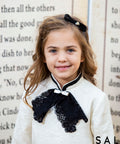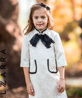 The Jacquard Elegance dress is made of luxurious jacquard with embossed figures in a delicate ecru shade. Straight silhouette and length above the knee. An impressive accent is The large black lace ribbon. Model with decorative pockets with black trim.