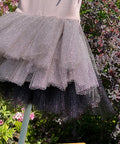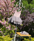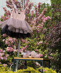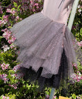Neyra is a combination of delicate fabrics - soft and elastic jersey in ash of roses and mesh with holes. At the top, the dress ties at the shoulders. The skirt is puffy, made of soft mesh in black and pink. The small ribbon at the front adds a subtle accent. The dress is perfect for holidays, photo shoots and special events when a look with character and class is needed.