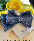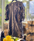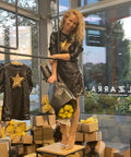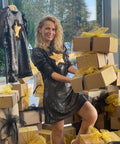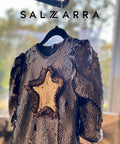 Starry Glow is made of black matte sequins. The model has long puff sleeves, a slight trapeze. It fastens with a zipper on the back. In the middle of the dress there is a spectacular star of golden sequins.
