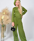 Moss Dream impresses with its softness and modern silhouette. Made of high-quality knit fabric in green. Loose, wide model, made with elastic at the waist. Decorated with a delicate golden element. For a full effect, combine with the Moss Dream blouse and beret.