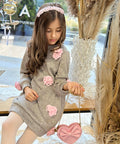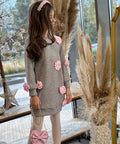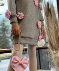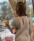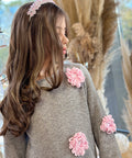 The Stellina blouse is made of soft knit with silver threads. The model is loose, with a round neckline and a button on the back. We decorated it with cute pink flowers. It goes beautifully with thick socks, boots and Salzarra's favorite coat.