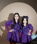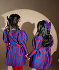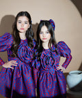 Amethyst Bloom е модел, който впечатлява с уникална комбинация от цветове и форми. Изработена от мек жакард в наситено синьо с флорален червен мотив. Моделът е с дълъг ръкав-буфан, който се стеснява надолу. Отпред е с ефектно обемно цвете от плата. Надолу се разкроява красиво. Роклята се закопчава с цип.